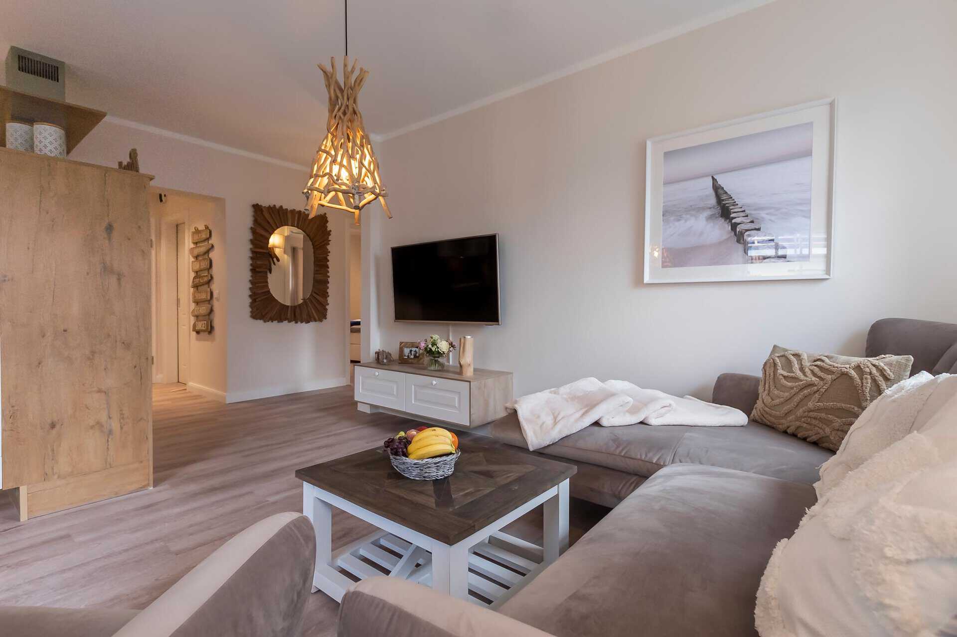 Treibholz 1 bietet einen eleganten Wohnbereich mit offener, voll ausgestatteter Küche und gemütlichem Essbereich. Vom Wohnzimmer gelangen Sie direkt auf die möblierte Terrasse, ideal für Frühstück und malerische Sonnenuntergänge. Die zwei Schlafzimmer mit bequemen Boxspringbetten und TV garantieren erholsamen Schlaf.