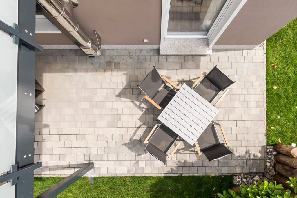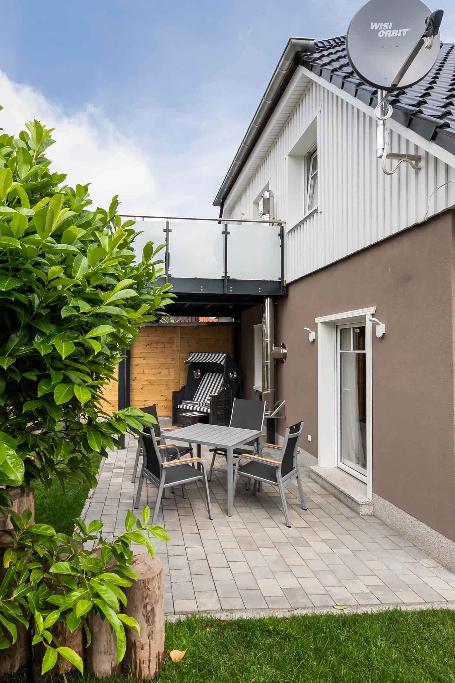 | Terrasse | große möblierte Terrasse mit Rasenfläche Strandkorb | Terrassenmöbel |